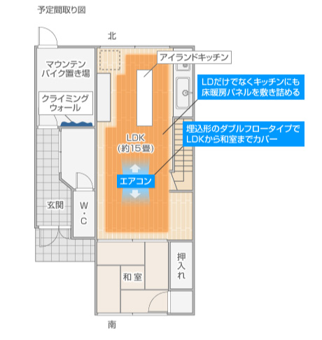 床暖房連動タイプのエアコンは、 LDKから和室まで縦長の空間をカバーするため、ダブルフロータイプを1階の中心部に設置