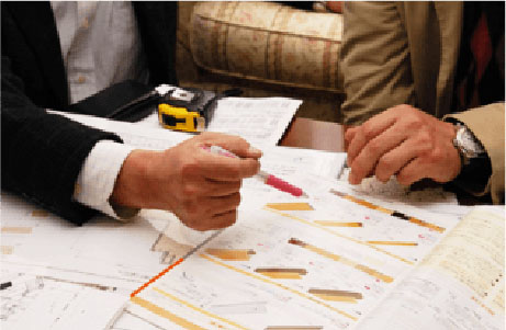 打ち合わせ当日は田辺社長(上の写真・左)と村上様(同・右)が出席。用意されたプラン図を囲んで、「7つの疑問」を中心に熱のこもった打ち合わせが展開されました。