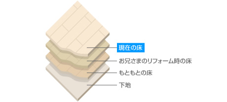 しかし、和室→前回の床→現在の床とリフォームを重ねたリビング側は、断面をチェックできる場所がありません。