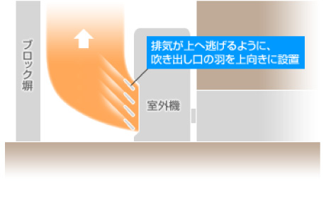 ただし、狭い隙間に室外機を設置する場合、室外機からの暖かい空気が隙間にとどまり、熱がこもりやすくなるため、冷房時の効率がダウンする恐れが。工事の際には室外機のファンの周りに、効率よく空気が逃げられるような処理が施されることになりました。