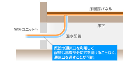 床暖房の温水が通る配管は、通常床面の下から設置します。「床面より上の壁部分に配管の穴を開けるのは構わないが、古い家だけに、床面より下、つまり基礎部分に新たな穴をあけるのは心配」というわけです。
