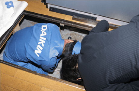 これを確認するために、スタッフが床下に入り、目で見て確認。配管の様子から、パネル1枚あたりの面積は、ダイキンのヒートポンプユニットでも十分対応できるサイズとわかりました。