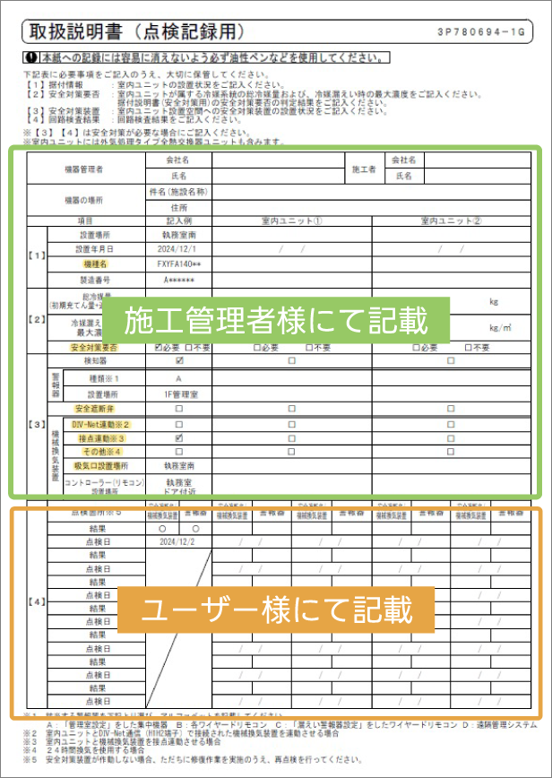 検査に必要な機種名、設置場所、冷媒充填量、安全対策の要不要、対策方法(遮断弁or換気設備)などの情報を製品に同梱されている点検記録表に記載して、お客様へお渡しください。