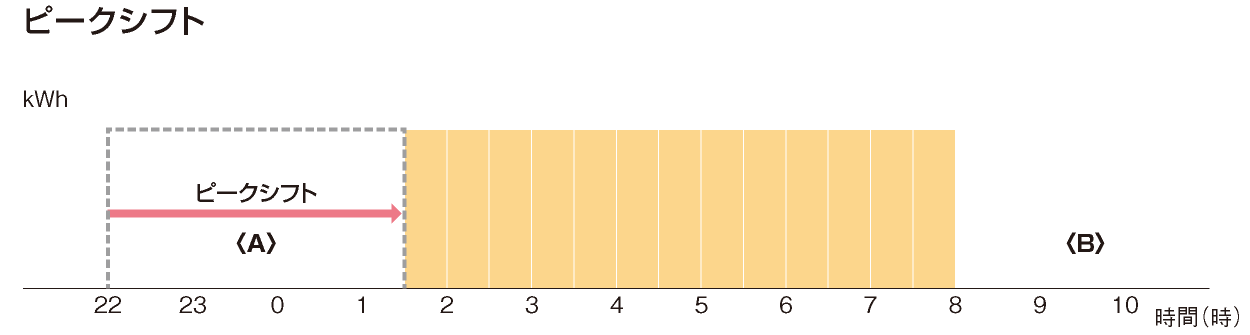 夜間時間帯終了時刻までに沸き上げることで、夜蓄運転のピーク〈A〉や朝方の電気使用量〈B〉を抑えることができます。